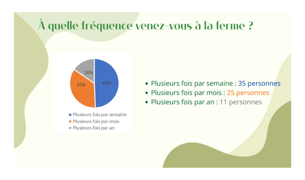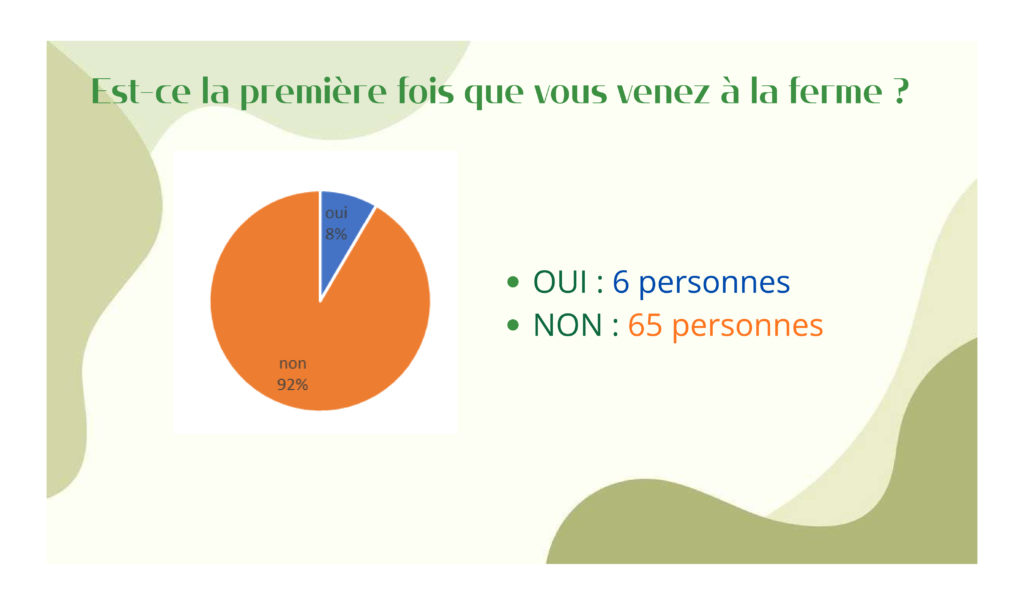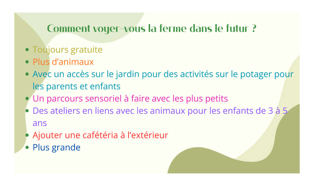 Pour clôturer l’évènement, Carla en service civique à la Ferme présentait son questionnaire réalisé le trimestre précédent par un sondage auprès des visiteurs à la Ferme. Sondage à consulter ci-dessous.