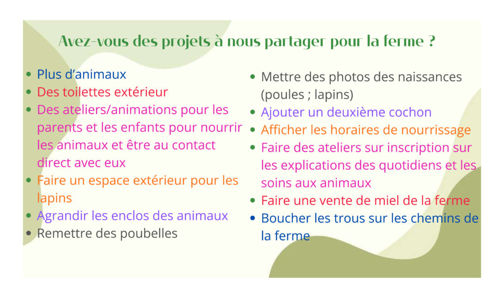 Par petits groupes chacun a émis ses idées, ses souhaits. Les principaux retours relevaient notamment le maintien d’une gestion associative de la structure, l’augmentation du nombre d’animaux, etc..