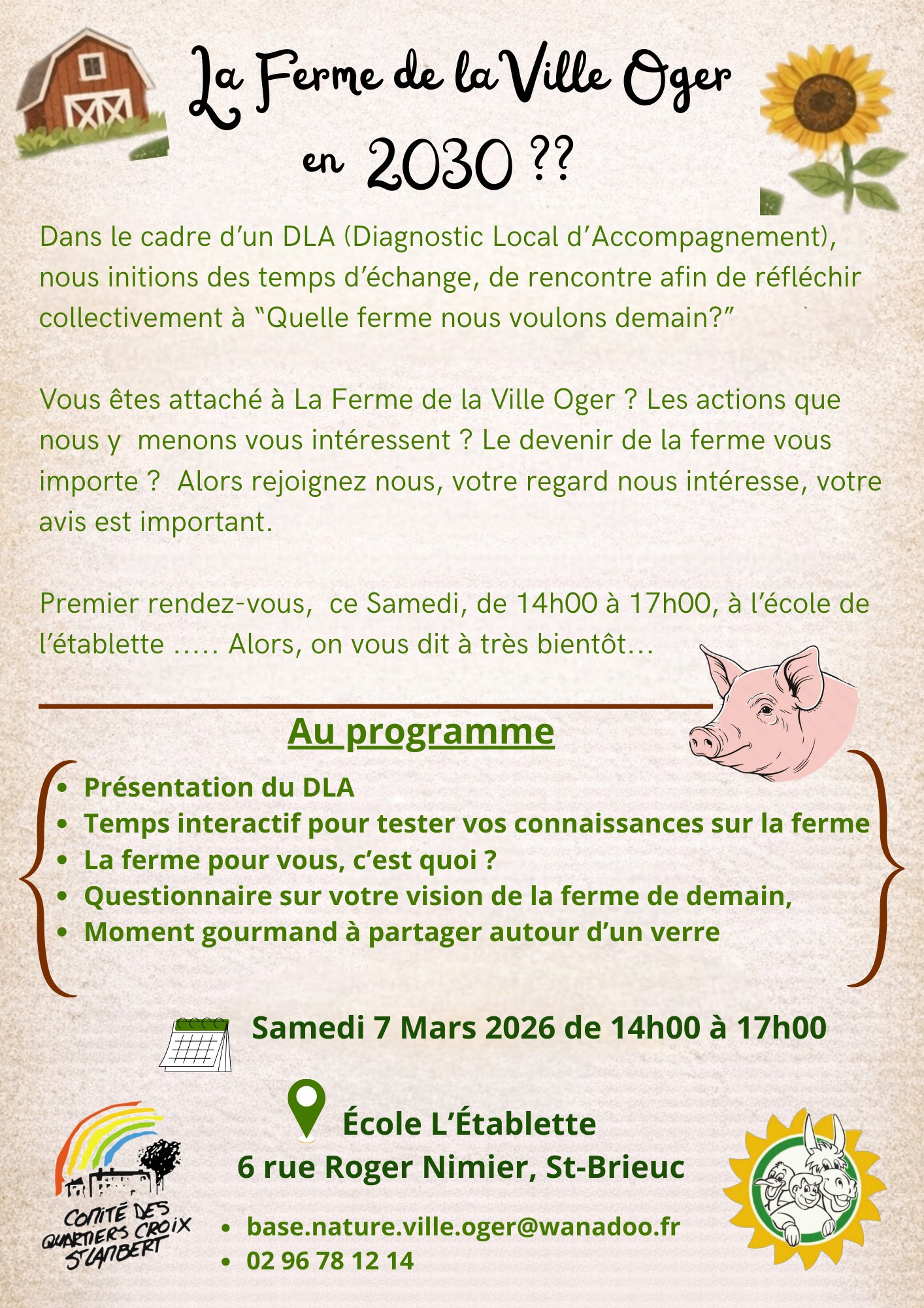 Le samedi 7 mars, nous, représentants du Comité des quartiers de la Croix nous vous convions à un temps collectif de réflexion pour co-construire la ferme de la Ville-Oger de 2030.